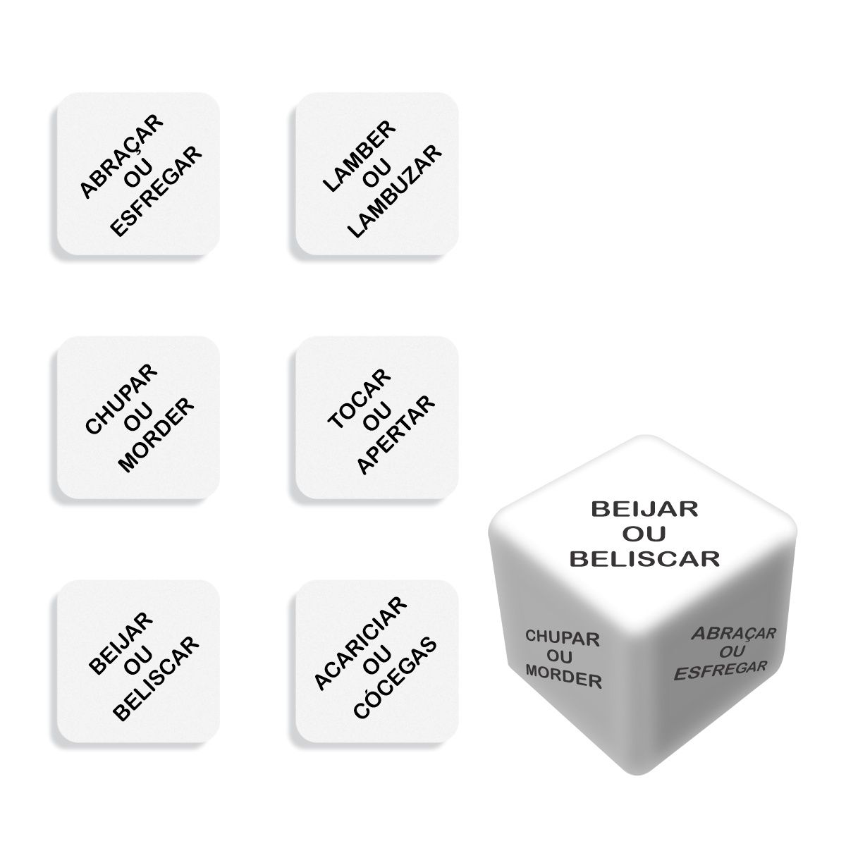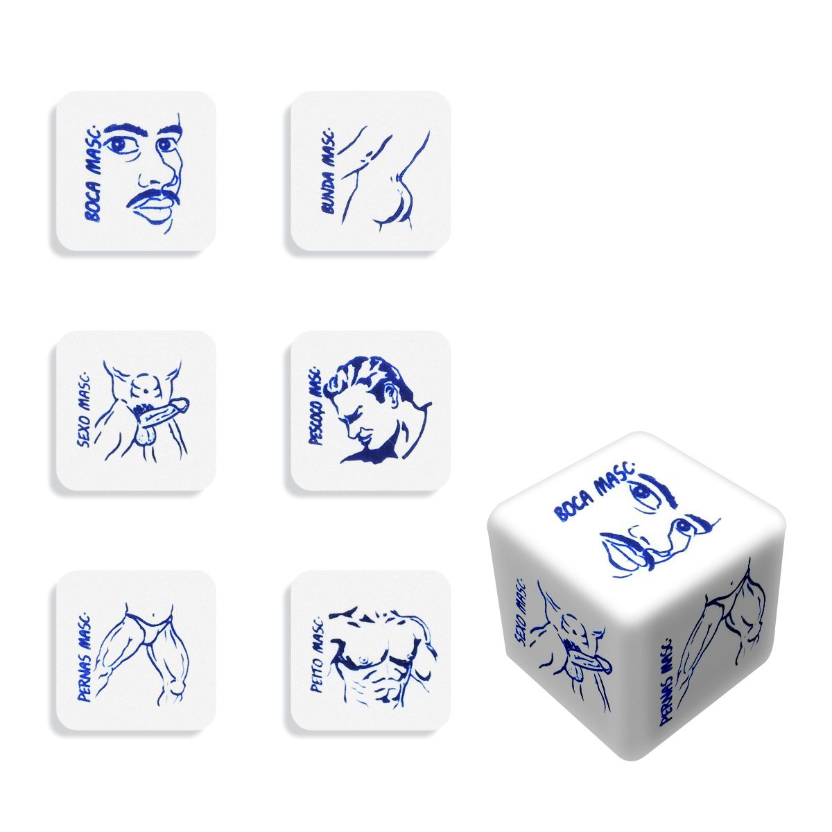El juego consta de dos dados, uno que muestra las zonas del cuerpo masculino: Glúteos, Cuello, Pecho, Piernas, Boca y Sexo, y el otro que contiene las mejores y más estimulantes acciones que puedes realizar en estas zonas: ¡Abrazar o frotar, lamer o untar, chupar o morder, tocar o apretar, besar o pellizcar y acariciar o hacer cosquillas!