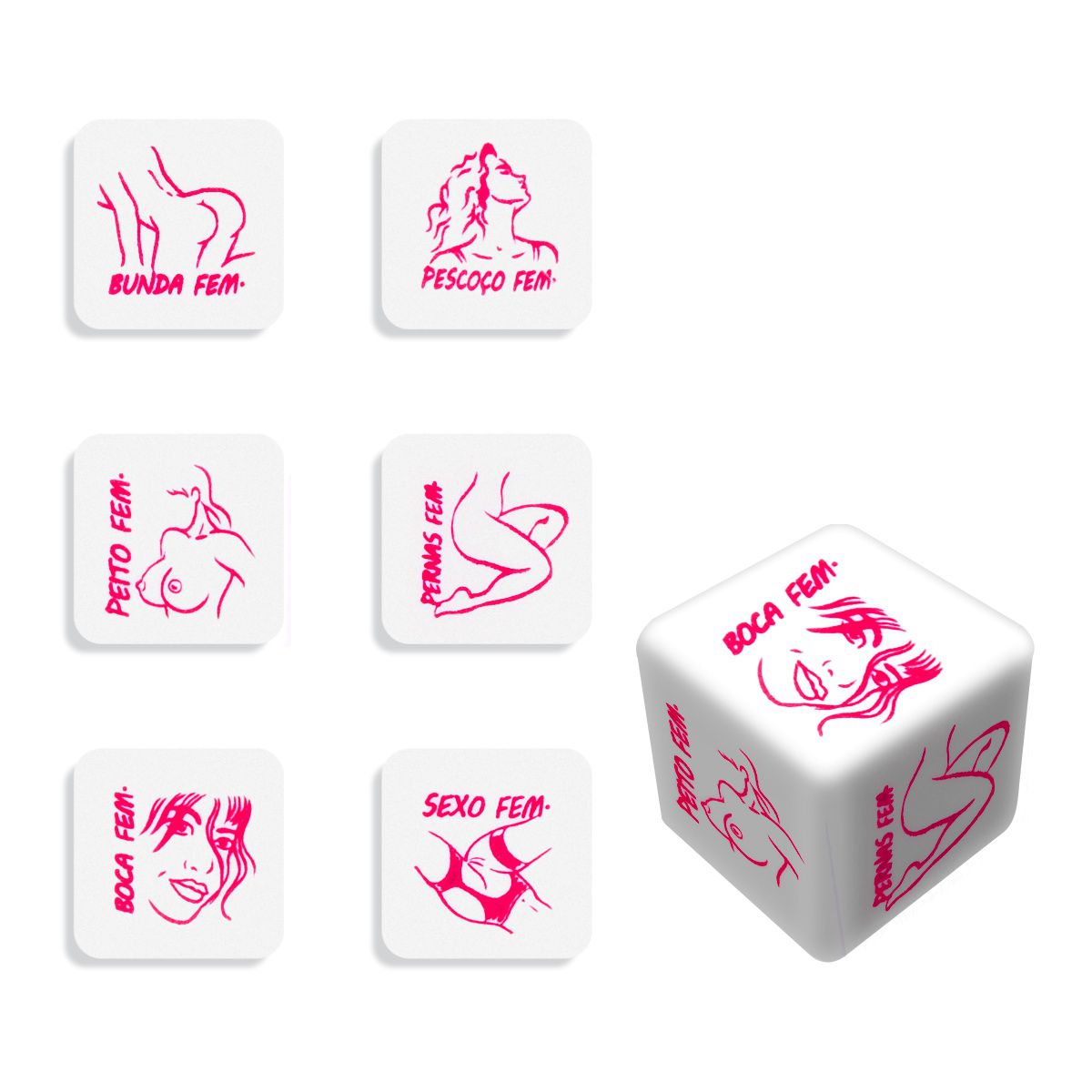 El juego consta de dos dados, uno que muestra las zonas del cuerpo masculino: Glúteos, Cuello, Pecho, Piernas, Boca y Sexo, y el otro que contiene las mejores y más estimulantes acciones que puedes realizar en estas zonas: ¡Abrazar o frotar, lamer o untar, chupar o morder, tocar o apretar, besar o pellizcar y acariciar o hacer cosquillas!